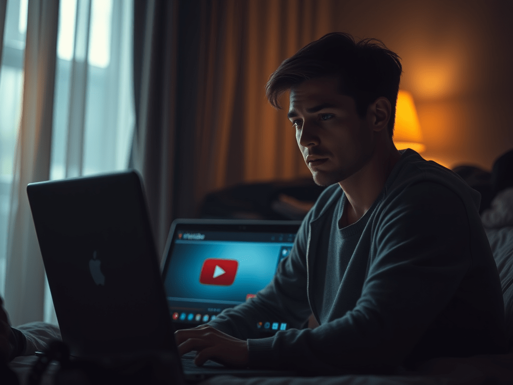 Create a highly detailed and sharp-focused image depicting a person in a dimly lit room, sitting in front of a laptop with the YouTube interface visible on the screen. The atmosphere should convey a sense of secrecy and tension, with soft shadows and warm light filtering through curtains. The subject, a person of indeterminate gender, appears contemplative, with a slight expression of concern. The background should include hints of personal belongings that suggest a hurried retreat. Ensure the image reflects a high-resolution quality, capturing every intricate detail for an engaging blog post feature.